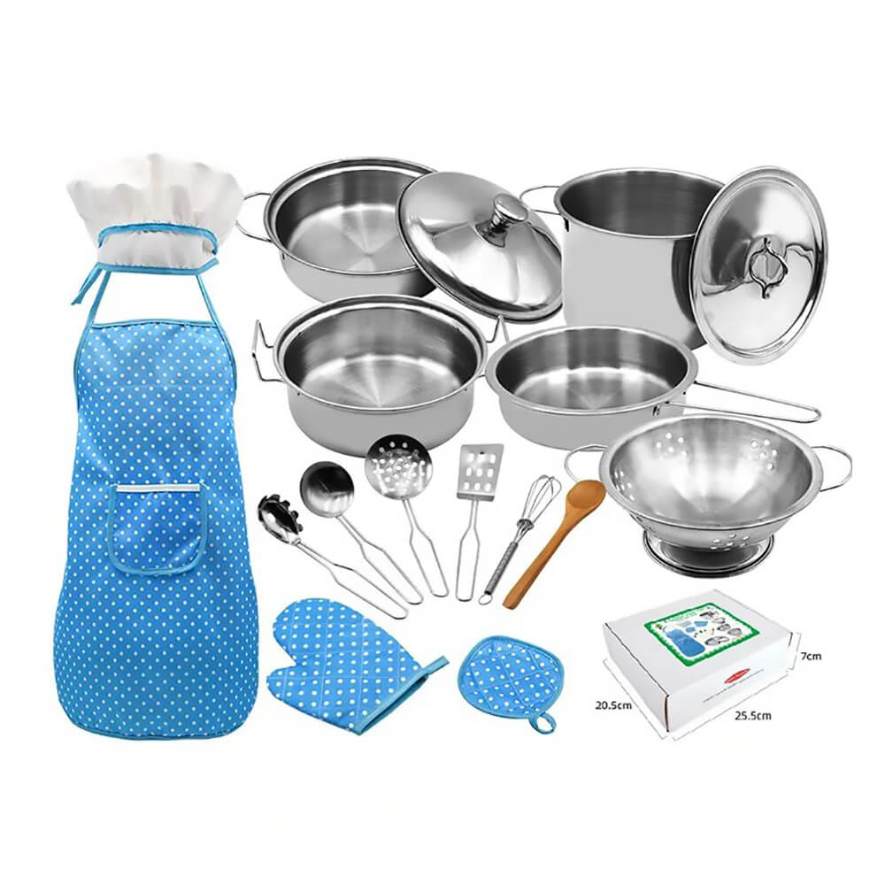 - Состав набора3х кострюля, 1х сковорода, 2х крышка, 1х дуршлак, 1х венчик, 1х ложка, 1х лопатка, 1х половник, 1х ложка с прорезями, 1х ложка для спагетти, 1х фартук, 1х шляпа шеф-повара, 1х кулинарная перчатка, 1х прихватка, 1х коробка для хранения