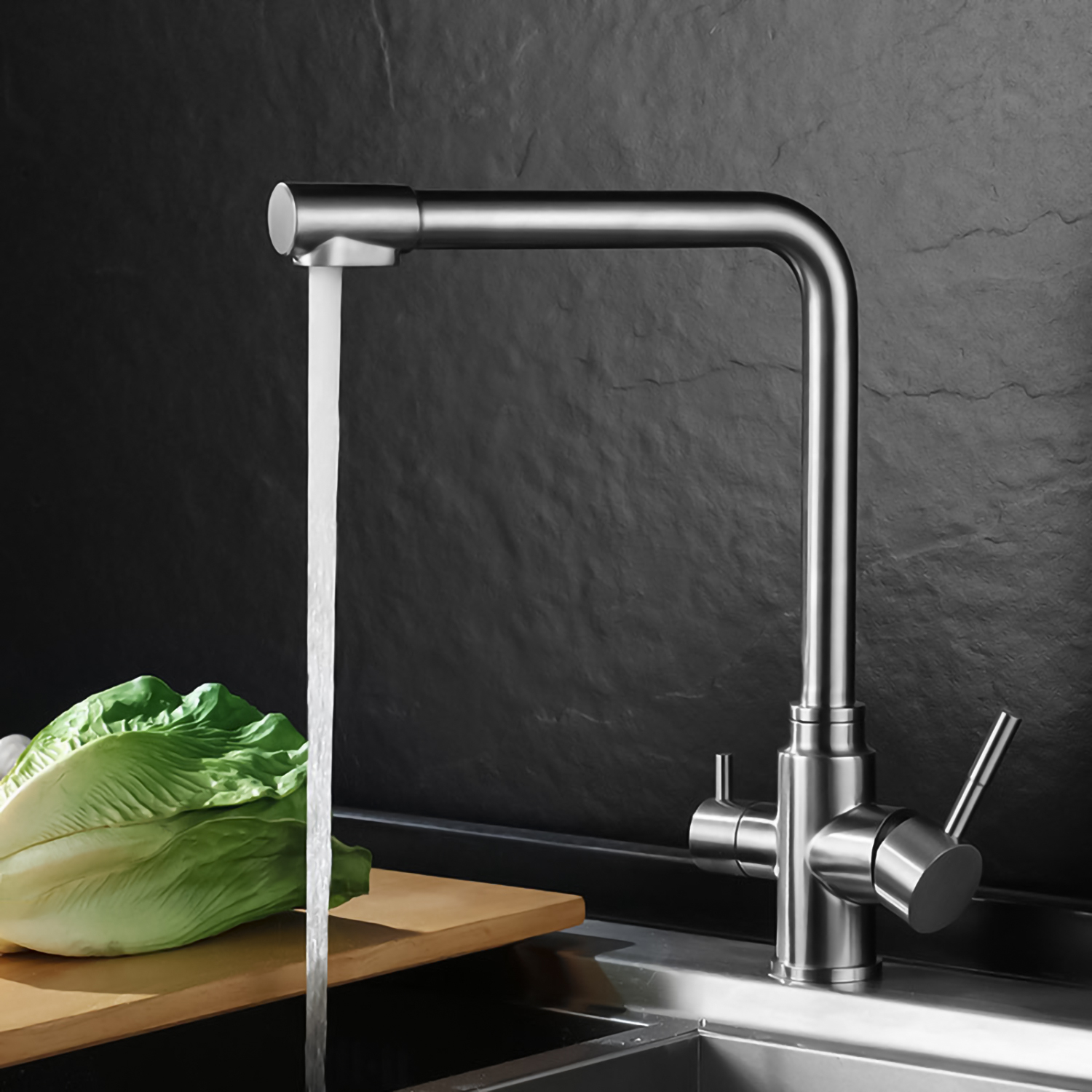 Этот смеситель имеет поворотный излив на 360 градусов, что обеспечивает удобство использования как в ванной, так и на кухне. Он изготовлен из нержавеющей стали, что гарантирует долгий срок службы и надежность конструкции. Кроме того, смеситель оснащен водным очистителем, который предотвращает застой и рост бактерий в системе водоснабжения.